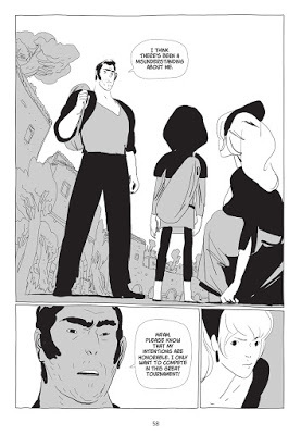 : A collaboration by French comics and animation luminaries Balak, Bastien Vivès, and Michaël Sanlaville, Last Man 1: The Stranger is the first installment in a series that's been popular in France and is now being released in the U.S. by First Second (who kindly provided a review copy). I always really enjoy reading graphic novels from various countries, and this was no exception.Peaks : The unique setting was, for me, one of the most intriguing aspects of the novel. Early on, we are introduced to Adrian Velba's world, a sort-of-medieval town where the annual gladiatorial games are the most anticipated event. But these are not your run-of-the-mill jousts or sword fights—the games are magical, and competitors fight in teams for the prestige, honor, and riches of the gold-filled winning cup.