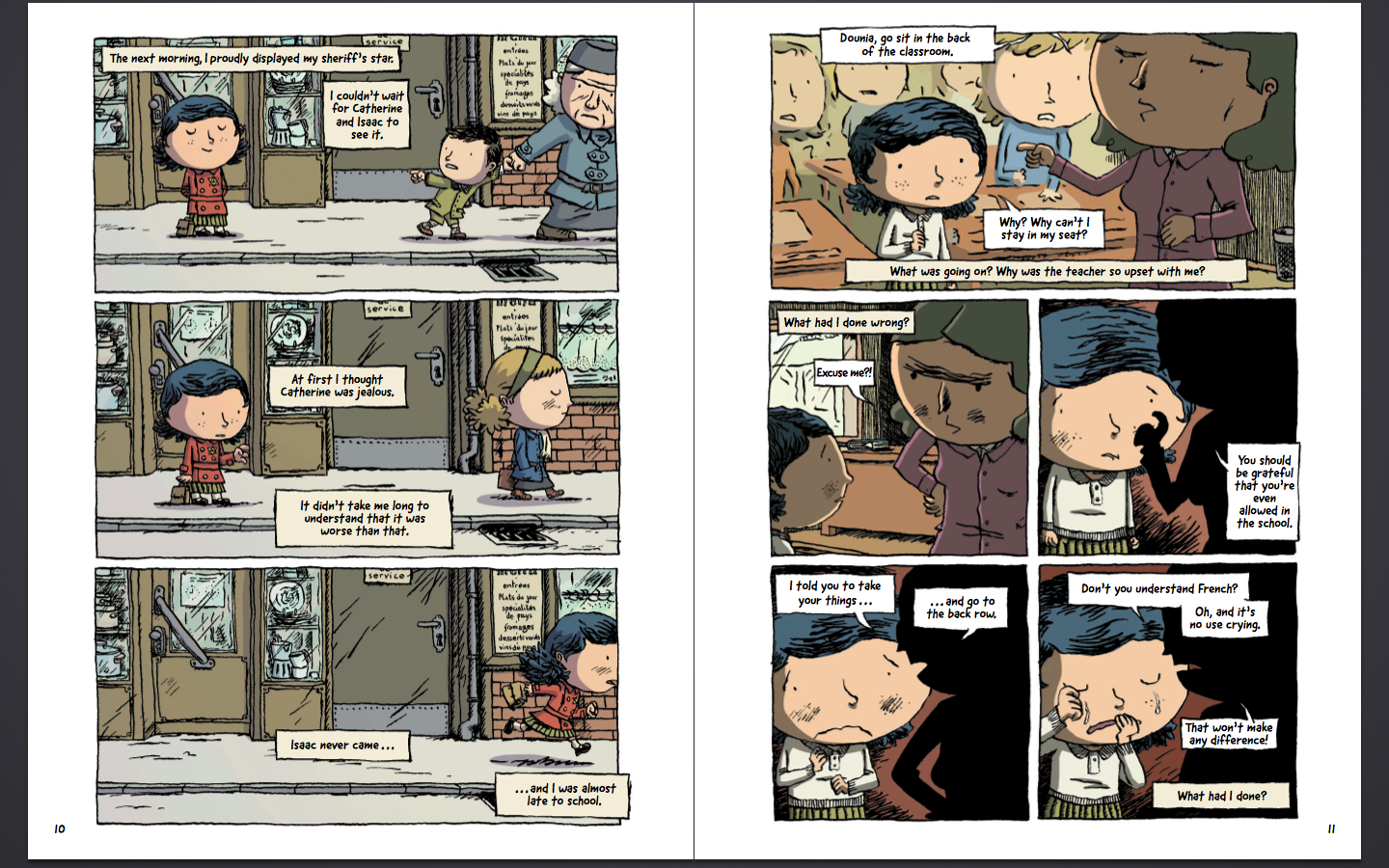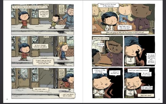 click to embiggenIn my opinion, this one avoided being didactic and remained rather sweet and innocent despite the subject matter, making it a good one for very young readers. The main character, Elsa's grandmother, makes a relatable narrator, and we see everything convincingly through her eyes: the story is faithful to a child's perspective, including the idea that children see a lot more than we give them credit for. Valleys : Will kids say "oh, no, not another Holocaust story"? I'm not sure. As already mentioned, there are plenty of stories about this time in history, but on the other hand, there are as many individual stories of the Holocaust as there are individuals around to tell them. For readers who aren't quite ready for Maus by Art Spiegelman, Hidden takes a gentler approach that nevertheless conveys the hardships of the Nazi occupation on Paris's children.