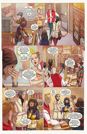 : I like it that there are nuances to Kamala's relationship with her family and friends. This isn't just the story of a poor beleaguered Asian-American girl with overly strict parents who can never go out or talk to boys. In fact, one of her best friends is a boy, Bruno, and her parents seem to be just fine with him. Her parents, while strict by American standards, love Kamala and try their best to explain their point of view rather than simply being portrayed as tyrants. As I've already mentioned, the variety and diversity of characters is a positive thing, and the colorful environment of Jersey City is nicely shown in the artwork that provides a backdrop for the story. And, overall, I just think it's a fun, fresh take on the old-school superhero comic. Kamala is a relatable teenage girl, and there's a strong subtext of empowerment (both symbolic and literal) throughout the story.Valleys : For me, I suspect the valleys here are things that would bug me about most superhero comics: moments of ridiculous dialogue and characters who are exaggerated for comic effect. At least the exaggeration and ridiculousness seems even-handed and no one group (or ethnicity) is targeted more than the others, as far as I could tell. If you don't like superhero comics to begin with, this one probably isn't going to offer you TOO much that breaks the genre mold.