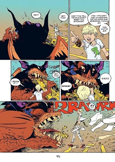 : These two volumes are fun, funny adventures that reward readers who are familiar with the tropes of superhero comics—they both adhere to and lightly mock many of the conventions of classic comic series. The writing is clever, and the artwork is engaging, with plenty of atmospheric detail in the city itself (reminiscent of, say, Metropolis or Gotham City) and villainous monsters who are just the right amount of ooky and creepy without going unnecessarily overboard. Valleys : I found it a little more difficult to distinguish what was happening in the action scenes (especially with multiple monsters) in the monochromatic The Rise of Aurora West--it was easier to tell what was happening in the full-color version of Battling Boy. Overall, though, that wasn't a huge issue; it didn't seem to be too important to my understanding of a fight scene to know exactly where Aurora just kicked which monster. (In his…um…monster junk?)