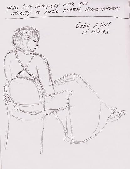 I honestly can't gush enough about keynote Mitali Perkins or the Skype presentation from Shannon Hale. They were awesome! I think my tweets are probably the best record of those particular sessions, as well as the one by the folks from #WeNeedDiverseBooks. There were a lot of provocative ideas brought up, and not-so-provocative things we should all think about and remember. A few of my tweets from the conference sessions (and a drawing of S.E. Sinkhorn from the #WeNeedDiverseBooks panel):Zetta Elliott: blanket policies that exclude self-pubbed books uphold the status quo.