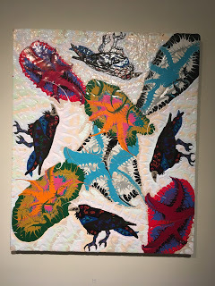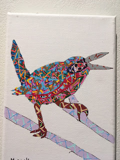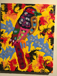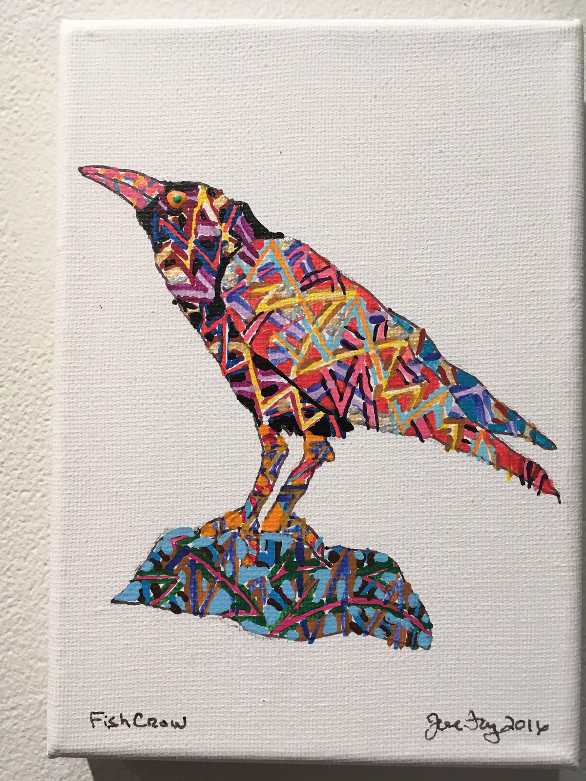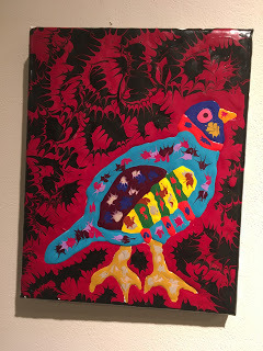 Don’t think the palette is primary colors. Fay doesn’t wax heavy-handed. His brush is a slender stream that wicks and tears wet paint into streams of thickets of acrylic. With pointed wings, Fay draws birds of Montana, friends he knows well. Aerial feeders open their beaks to the sky. A Black Crowned Night Heron watches from a neon branch for its prey. Ravens circle a landscape as if enchanted by a spell. The thick soup of foam and paint glisten as jewels sprayed clean by morning mist. Paint appears to continue bleeding like a stream of marshmallow. I refer to the sap of the Althaea officinalis which was reserved for gods and royalty of the ancient Egyptians, nor corn starch.