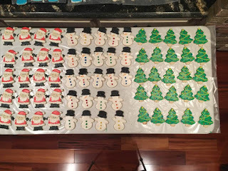 I found last year that using my cell phone as a timer was handy. At eight minutes look at the cookies. IF edges are slightly brown they are done. If still white wait one more minute. Total cooking time 8 -9 minutes.Temperature, ovens, moisture and weather are part of getting this down to perfect.Cookies should have room around them. When you put on the sheet they need about an inch and a half on all sides.Cookies done- allow to cool a couple minutes before you move them to the decorating surface.Now you need some helpers. Make a couple bowls of icing. stick salted butterbox powdered sugarteaspoon vanillaA tablespoon or more of whipping cream ( buy the little carton of whole whipping cream)Beat for about 2 minutes - if you want it thinner add more vanilla or cream