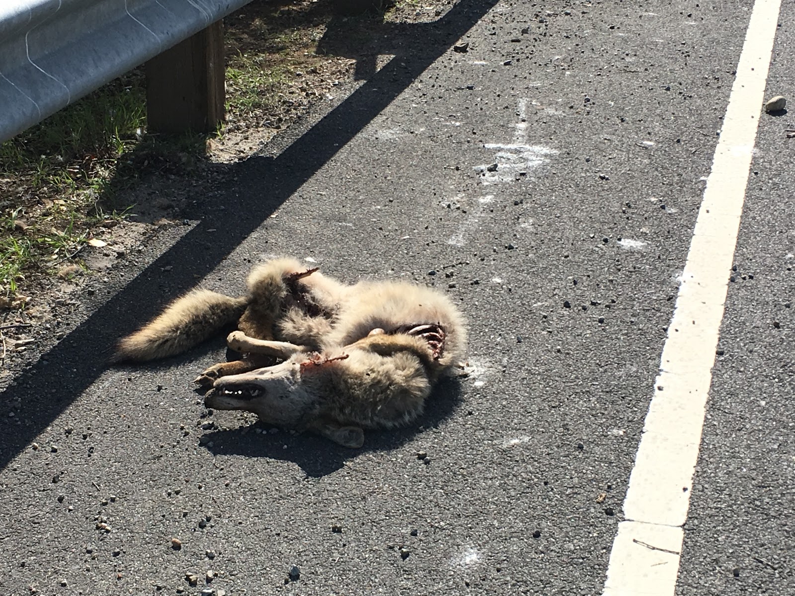 Coyote carcass on the road in lanesHook a wince I haul it off to safetyThere’s a man who drives wild past every daycoming and going, today makes eye contactThis one time he stops to help and I say.