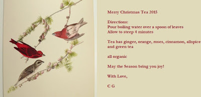I gathered organic herbs from my gardenRecipe ~Combine:Orange peel, ginger, rose petals, cinnamon, pinch of thyme,allspice and rooibos and green tea.Fruits and roses are 1/8 portion, spices 1/16 Homemade and heavenly
