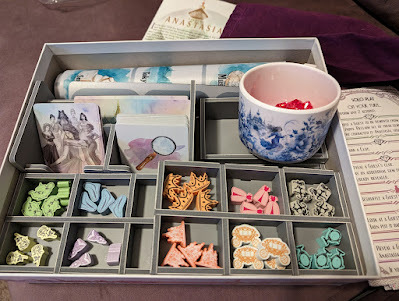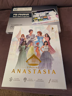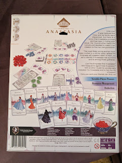 It took three long years, but I finally received my copy of Finding Anastasia in the mail, a game I had backed on Kickstarter and promoted in my board game post last year. This game is breathtakingly beautiful and tons of fun at parties, so it's a shame that it isn't more widely available. Inspired by the historical legend that was popularized by the beloved 1997 animated movie, Finding Anastasia is a social deduction game in which players who claim to be Anastasia are given invitations to a tea party held by the Empress to find her long-lost granddaughter before Rasputin's spies can eliminate her. The Kickstarter campaign for this game ran for a long time, allowing many upgrades to pass into its final production, including a gorgeous custom teacup to hold the jewels, tarot-sized player cards with original artwork, and a beautiful box that can be mounted on a wall when not in use.