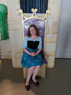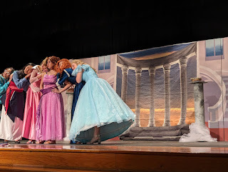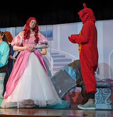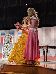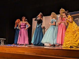 This year's show, which is freshly written by students each year, revolves around Ariel wanting to give Eric the perfect gift for their anniversary, but none of the princesses can remember who had it last! So they must fly all around the world on Jasmine's borrowed Magic Carpet to each princess's kingdom in search of an old compass that Ariel found in the ocean and wants to return to Eric. The sets for each kingdom are pretty simple, mostly consisting of a background poster and table containing some recognizable trinkets from that princess's story. Throughout the show, we travel to France, Mount Olympus, Corona, Arendelle, and finally back to Atlantica. Each journey involves the princesses sitting in front of the stage on a roll-out magic carpet (until it gets stolen back by Aladdin) and harmonizing to beautiful Disney songs. Their first performance, an a capella rendition of "Colors of the Wind" was my favorite from the show.