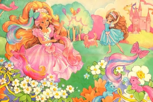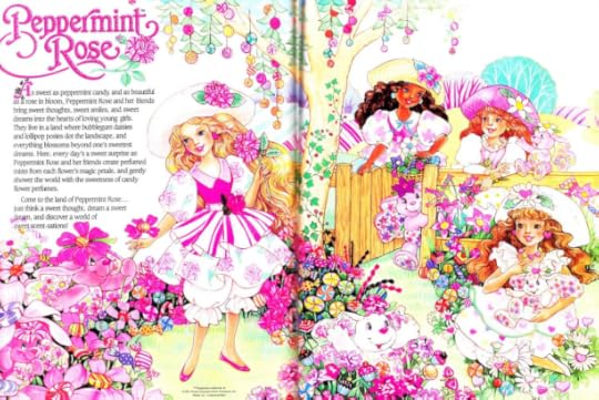 Pictured above is Lady Lovely Locks, a cartoon series from 1987 that encapsulates the look and feel of feminine nostalgia. Though it had short episodes with a simplistic story, the visuals of this series and others like it inspired a generation of girly girls that no longer exist in modern media. The heavy use of the color pink has gone out of style thanks to modern sensibilities, and the big, pretty dresses and hairstyles would get in the way of princesses who need to fight to save their kingdoms. It's no longer acceptable to portray princesses or animated heroines dancing around in flower fields just looking pretty and being happy. Another property I admire purely for the aesthetic is Peppermint Rose, which is pictured below. Her cartoon special from 1992 may be a confusing mess, but the artwork on her merchandise is lovely.