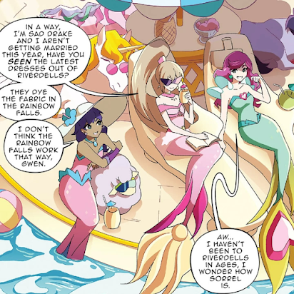 I've seen reviews for both volumes criticizing the inconsistent storytelling that jumps from one plot thread to another with no transitions. While I don't entirely disagree, I'm so happy to have more Jewel Riders in my life that my nostalgia goggles may make me immune to its flaws. Like the first graphic novel, this volume is chock-full of references to various episodes of the show, making those of us who loved it as children feel seen and appreciated. The first time we see our heroines, they are lounging in their mermaid tails from the episode "Jewel of the Sea," in which they received the ability to transform into mermaids at will. It's so cute to see them have a "girls' day out" where they decide to hang out as mermaids. Not only does it add to the lore of the show, but it also enhances the theme of friendship by demonstrating that they could have fun together in any form.