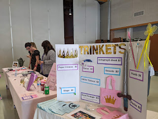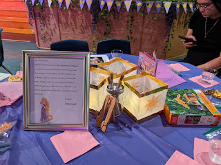 The event setup was similar to last year, with student helpers walking around in mouse ears to seat guests at their tables. The entryway to the event was a big castle archway with Rapunzel's floating lanterns hanging over it to match the theme. They had the same photo spot with a pink castle background in the lobby and many fun princess items like tiaras and wands being sold to the kids. Also like last year, each table was themed after one of the princesses at the event. The table contained letters written by each princess to welcome their guests as well as storybooks and activities relating to that princess. I was seated at the Rapunzel table with an alumnus of the Princess Tea. Snacks and drinks were served along with princess-themed cupcakes containing plastic Disney Princess rings. The stage was decorated with Corona flags from Rapunzel's kingdom.