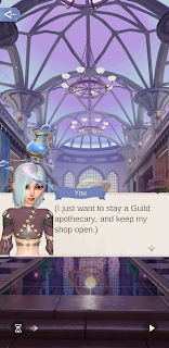 As Time Princess has done for a while, The Apothecary features three companions--two love interests and a friend. Of the three, Clement is my favorite by far. In fact, he might be one of my favorite love interests in the entire game. He is a brooding magician donning black and purple robes with the ability to see into the future due to becoming the avatar of a god named Beornric. He hides many secrets, most of which revolve around protecting Emelia. Upon learning his full story, I don't know how it's possible to even consider any other companion's path. Tate comes off as a bit of a sleazebag, hitting on Emelia as soon as he meets her. His story as a bard whose music no one can listen to is a bit tragic, but he never lets that get to him due to his carefree nature. Morgana, the catgirl, is more of a mixed bag. She is very clever and likes to play both sides, making her difficult to trust. However, it is worth playing her path to learn her true identity.