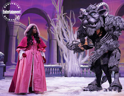The production felt more disjointed than The Little Mermaid Live! due to the jarring cuts between animation and live-action and the randomness of their placement. During The Little Mermaid, it was clear when a live-action sequence was about to began because it would cut to the audience watching the show on a screen during the introduction of a song, at which point the actors would walk onto an intricately crafted set for that particular number and sing it. Here, there were parts where the animation would cut to the audience watching it on a screen for no reason as well as random scenes that turned into pencil tests and live-action sequences that had no reason to be live-action, such as when the wolves changed Maurice and later Belle through the woods. It made the both the movie and the live-action sequences feel like they were constantly getting cut off, unlike the strategically placed musical numbers in The Little Mermaid. Even the sets were disjointed at times, such as the opening number in which Belle walks down the streets of the Disney studio lot in Burbank with some fake-looking cardboard cutouts of her small French town that weren't even colored in. I can tell they were going for an artsy look, but it wasn't consistent with the rest of the show.