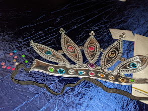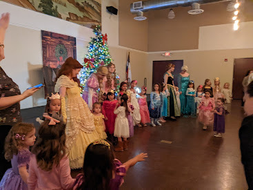 After that, the event hosts passed around metallic fabric tiaras with stick-on jewels to decorate them with. The tiaras were mainly given to the children, but the hosts graciously provided me with one as well. This was the only craft of the evening, which was a little disappointing since the event description made it sound like there would be multiple crafts, but the tiaras looked very nice considering that they were made of fabric. After a quick photo op with all the princesses on a castle backdrop, it was time to begin the evening's festivities, which consisted of a group sing-along of "Let It Go" and two Christmas songs. The little princesses formed a circle with the five main princesses, and the adults stood outside the circle and took pictures. There wasn't a whole of dancing aside from a simple arm movement during the chorus of "Let It Go," and the little princesses were not particularly energetic, but they did the best they could.