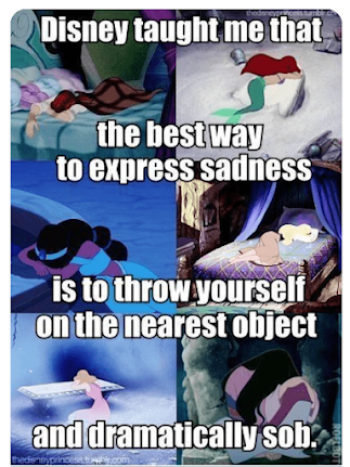 The overdramatized sadness of earlier princesses is something that is frequently memed about with the phrase "Disney taught me that the best way to express sadness is to throw yourself on the nearest object and dramatically sob." While this is typically used for light humor, it expresses how many of us grew up learning to come to terms with our emotions. The commonality of princesses expressing negative emotions in their films is in stark contrast to the way they are portrayed at theme parks and parties, as these events are meant to inspire joy in children. My friend and I observed that if we ever mentioned anything negative to princesses we met in theme parks, they would brush it off and change the subject. This is not exactly the same as toxic positivity because they are paid professionals who are meant to have brief positive interactions with guests, but it is still a form of denying reality.