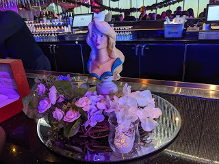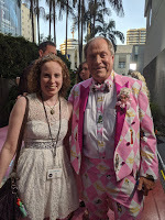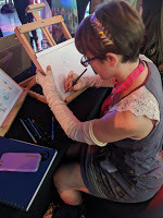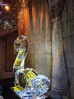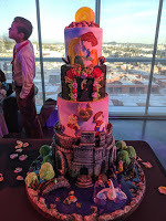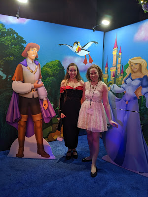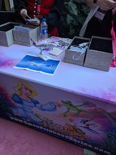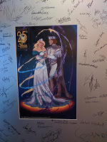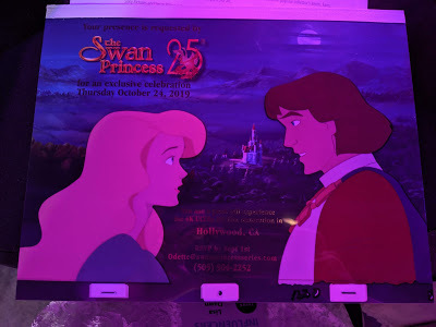 The fun continued upstairs where a full banquet was being held in the movie's honor. Near the elevators, a glass swan was on display in front of a sign-in board that featured an art piece from the movie's supervising animator Steven Gordon that was created exclusively for the 25th anniversary. The banquet was decorated like a wedding with Swan Princess-patterned fabrics surrounding the columns and flowers garlands draping the ceiling. A life-sized cardboard backdrop of Odette and Derek was available for photo ops as well as a traditional photo booth. Dinner was served with a complimentary buffet, open bar, and decorative cakes that were judged in a contest later that evening. Each table had a centerpiece featuring an original sculpture of a character from the movie. There was also a wall of original cells from the film and a table where two artists drew sketches for the attendees. I spent a good chunk of the evening talking to the exuberant Talia Ellis, who drew a sketch of Jean-Bob for my friend and Odette for me. Both artists were hand-picked by Steven Gordon to entertain the guests with their drawings and conversation.