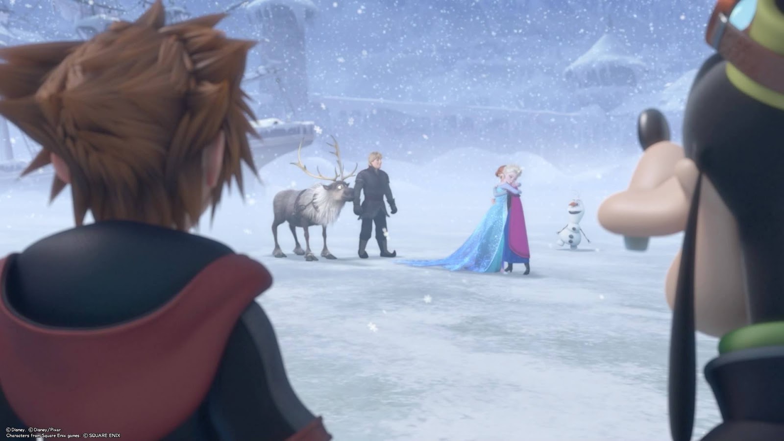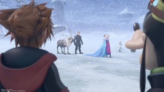 Arendelle from Frozen turned out to be one of my least favorite worlds in Kingdom Hearts III. As much as I would have loved to explore the sparkling interior of Elsa's ice palace, the game gave me nothing but endless labyrinths and snow-covered mountains to explore. It goes on for so long that everything starts to look the same after a while. Even though Sora cannot go inside Elsa's ice palace, the entire game stops and forces us to watch a shot-by-shot recreation of the scene where she sings "Let It Go." The. Entire. Flipping. Song. Many of the Disney movies featured in the Kingdom Hearts series are musicals, but this is the first time I have ever seen one of the games stop all the action to watch a character sing a song in its entirety. The world of Atlantica in Kingdom Hearts II did have a series of minigames in which Sora helps the characters sing songs from or inspired by The Little Mermaid, but that worked because it was incorporated into the plot of the game and allowed you to participate in the songs as a player. This, on the other hand, was just Sora watching a scene from the movie that most of us have already witnessed a million times and are probably sick of by now. Not only did I find it jarring, but it also took me out of the game for a few minutes. What's worse is that most of the Arendelle world involves Sora running through the snow by himself because unlike Rapunzel and Eugene, neither Anna nor Elsa accompanies him on his journey.
