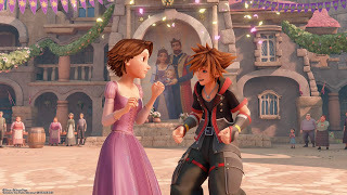 The bulk of the game consists of exploring the worlds from various Disney movies. My favorite world in this game was the Kingdom of Corona from the movie Tangled. Scenes from the movie were recreated shot by shot using the video game's graphics engine, which boasts incredible detail on fabric and hair follicles. One criticism I have about the way Kingdom Hearts III portrays Disney movies is that they leave out crucial scenes to the plot and assume that anyone playing has already seen the movie. In the Tangled world, nobody bothers telling Sora that Rapunzel has magical hair with healing properties, so when he witnesses the ending of the film, I'm not sure how he's supposed to know why cutting off Rapunzel's hair is a problem or how it turned brown. However, I did like that the world incorporated continuity by allowing you to return to Corona later and repeat a dancing minigame from the village festival with updated animation that matches her new hairstyle.