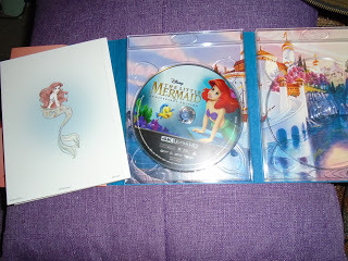 on Platinum Edition DVD, I wrote my concerns to their marketing department about the dim colors during certain pivotal scenes of the film's restoration as well as the lack of behind-the-scenes footage in their bonus features. A few years later, the film was restored again and released on Blu-ray for the Diamond Edition. That version cleaned up the colors and contained a few behind-the-scenes bonus features. However, I did not own a Blu-ray player at that time. Today, my ship has arrived because the PlayStation 4 I purchased to play Kingdom Hearts III on also works as a Blu-ray player, allowing me to thoroughly enjoy the latest Anniversary Edition Blu-ray release of The Little Mermaid. With Disney's marketing department on overdrive this year, there are three versions available of this release. The Target edition features exclusive cover art and a gorgeous booklet containing concept art, trivia about the film, and an illustrated retelling of the story. The Best Buy Steelbook version contains original artwork of Ariel on the front and back by Disney veteran Paige O'Hara, who played Belle in