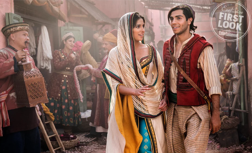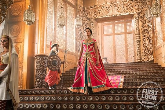 Of all the looks I've seen for Jasmine, I think this marketplace disguise from when she meets Aladdin for the first time is my favorite. It's also the only promo image released that shows her smiling. Even though it doesn't exactly scream "peasant," the sheer veil that covers her head and drapes around her shoulder looks both cultural and stylish at the same time. The subtle gold trim around the robes hint at her true identity, and I like how her teal pants are still visible underneath. Aladdin, on the other hand, doesn't look very much like a street rate at all with his striped button-down shirt, thick red vest, and plaid pants. I can understand where many of the complaints about these new images are coming from, but I'm grateful that we got to see so many of the costumes so early before the movie's release. Overall, it looks like what I would expect from a modern live-action remake of Aladdin. At the very least, we can take solace in knowing that Jasmine's costumes are far more regal and fitting of a princess than the hideous yellow dress wore as Belle in the remake of Beauty and the Beast.