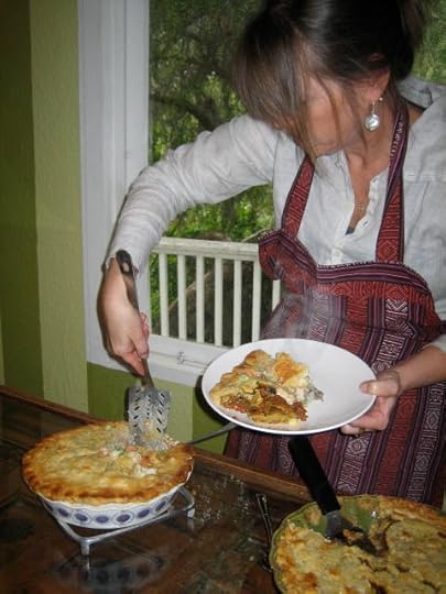 All the while, I should add, Amy is guiding our discussion and serving the pies she baked. There is a Lemon Shaker Pie with a Whole Wheat Crust; Chicken Pot Pie with Thyme Cream Sauce and Lemon Crust; mini Orange & Lime Cream Pies with Macadamia Crusts; and my favorite, the greatest thing I've ever eaten in my life, a Persian Beef Stew Pie with Eggplant, Lime, and a Seedy Lavosh Crust. (Amy, can you send the recipe… or maybe just move in?)
