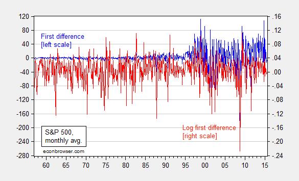 Figure 2: First difference of S&P 500 stock price index (blue, left scale) and first difference of log (red, right scale). Source: FRED, and author’s calculations.