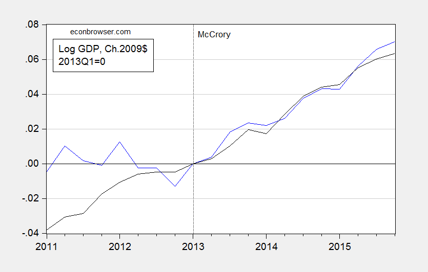Figure 1: North Carolina GDP (blue), and US GDP (black), both in Ch.2009$, 2013Q1=0. Source: NC from state GDP release (June), and US from NIPA (2016Q1 2nd release).