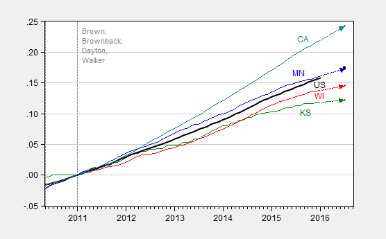 Digression on fixed effects: At least back in June 2015, Professor Russell made a point of highlighting the difference in extent of slack in the Californian economy vs. the Kansas, arguing that when there is lots of slack, employment growth will tend to be fast. Hence, in his view, the relatively slow Kansas employment growth in Figure 1 is due to the smaller amount of slack, as measured by unemployment. However, apparently, Professor Russell has forgotten about fixed effects. Over the 1976-2007 period, California unemployment is typically about 0.77 percentage points higher than the national average; so the March 2016 California rate of 5.4% is only 0.4 percentage points higher than the national average. By that criterion, California’s labor market is tight. The Kansas situation is the opposite. On average, Kansas unemployment is 1.67 percentage points lower than the national average, and yet, as of March, it is only 1.1 percentage points lower. Hence, there would seem to be more ecnomic slack in Kansas than in California, by this criterion. Given this, the argument that California employment growth is faster because of more slack seems dubious to me. (Additional graphs of CA vs. KS in employment and coincident indices here).