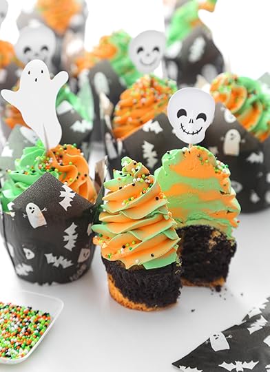If you're in need of fun Halloween party fare, then these colorful cupcakes just might be the treat for your ghoulish guests. They are swirled with Halloween hues from top to bottom, and they owe their spooky-cute charm to ghostly parchment wrappers and cupcake toppers.