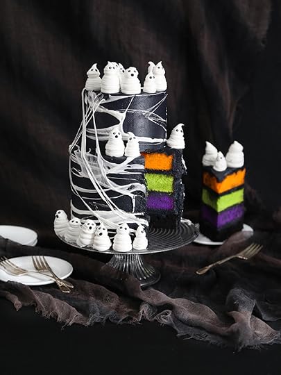 Next Wednesday is Halloween, so I've been baking all kinds spooky things lately! I recently whipped up this ghostly cake for Food Network's website, and it's been one of my favorite projects this season. The process of building the cake was so much fun and it's not difficult to put together. If a two-tier cake seems daunting, the recipe can be baked into a single nine-inch 4 layer cake.