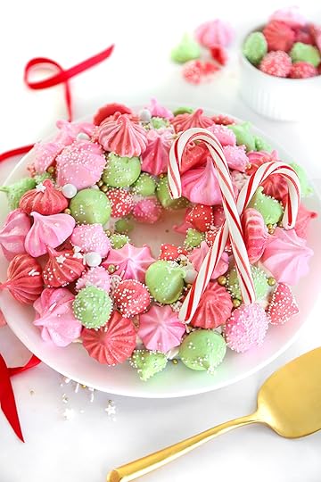 When the weather is cold and dry and my hair has enough static electricity to stand on end, I know it's the perfect low-humidity day for making meringues. It's not hard to whip up a big batch, and I'd been dreaming of pink, green and red cookies for a few days. I piped them in all shapes and sizes, and used white nonpareils for texture on some of them, too. All piled together they remind me of Christmas tree ornaments.