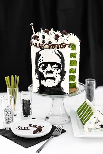 I love black silhouette technique on white-frosted cakes. You may remember my Portrait of Poe red velvet cake from years ago, or last year's Scary-Good Skeleton Cake for the Etsy Journal. I'm happy to add this green monster cake to the roster and perhaps someday a proper Nosferatu!