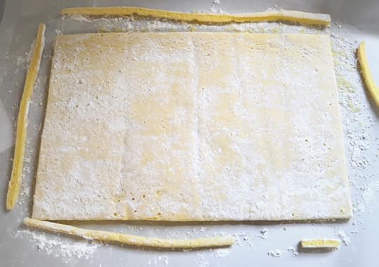 Remove the top sheet of wax paper and trim the edges of the dough square.