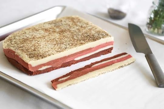Once the slab of "meat" was assembled, I sprinkled on the Applewood salt and some freshly ground black pepper. The sliced dough yields a well-balanced cookie, with the salt and pepper crust just at one edge. I love the playfulness of this treat, but it's really delicious too. The recipe is based on the Scottish shortbread recipe in the Sprinkle Bakes book.