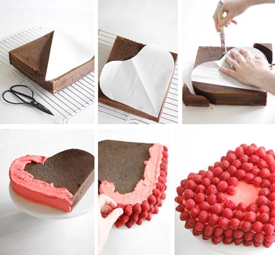 Trimming the cake into a heart is easy-peasy, just lay the template on top of the cake and cut around it with a serrated knife. The rest comes together rather quickly - just spread on a layer of frosting and go crazy with the berries.