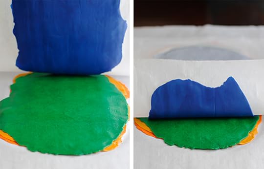 Continue to stack the dough pieces on top of each other. The order should be red, orange, yellow, green, blue and lastly, the violet dough. When the dough is stacked, flip it over on a large piece of waxed paper, so that the red dough is facing upward, and roll it thinner, to about 1/4-inch thickness.