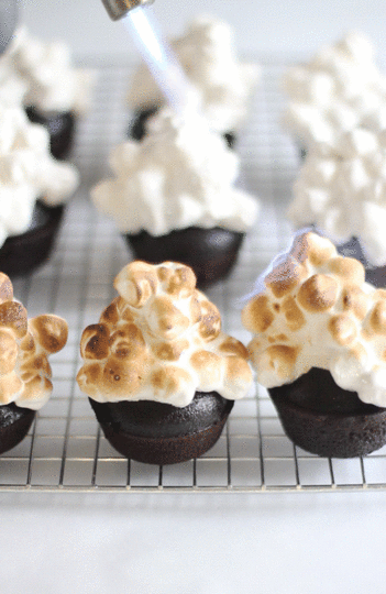Pile meringue high atop each cupcake and brown with a kitchen torch. Alternatively, place the meringue-topped cupcakes on a large baking sheet and place them under the oven broiler for a few minutes (watch them constantly to prevent burning!) until the meringue is well browned and slightly puffed.