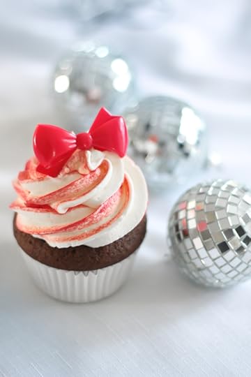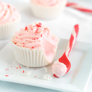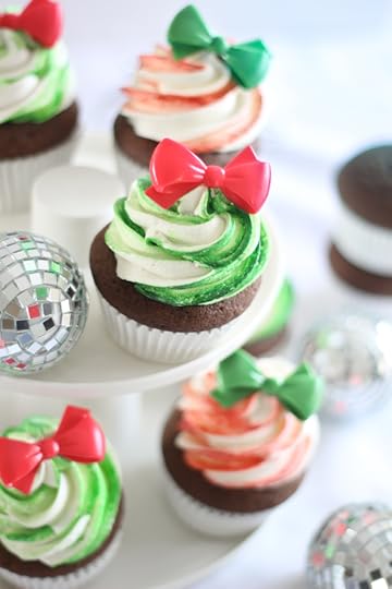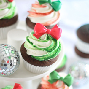 Fit a piping bag with a large closed star decorator tip (Ateco 847). Dip a small artists’ brush in the red or green food color and paint 4 well-spaced stripes onto the inside of the piping tip and all the way up the piping bag. Carefully spoon the frosting into the piping bag and pipe swirling mounds of icing (about 3 passes) on top of the cooled cupcakes.