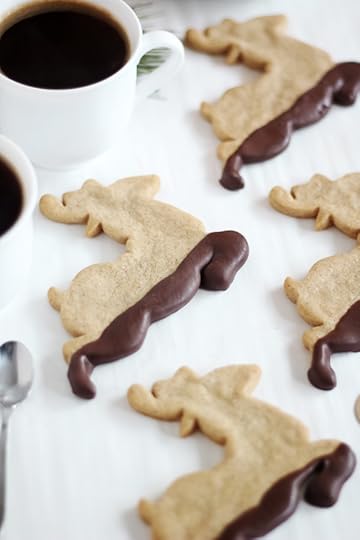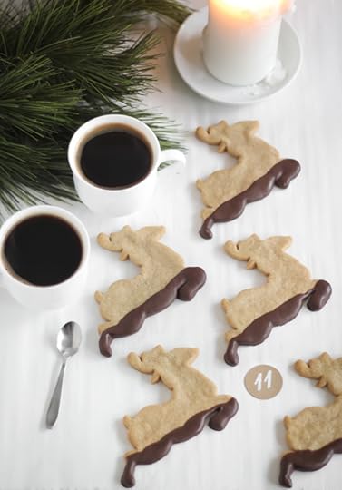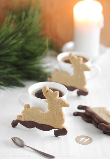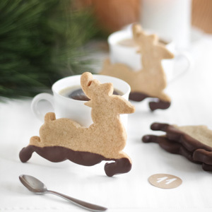 These guys were "muddied" with melted semisweet chocolate. It gives the cookies just a little extra sweetness, and that makes them delicious with hot tea or strong coffee. You could also dip the cookies in white chocolate - I'm sure the reindeer encounter many snowy rooftops on their travels as well!