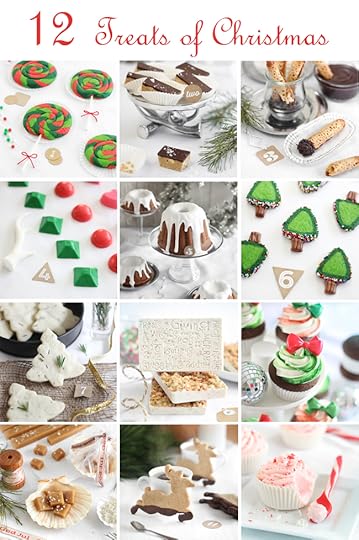 1. Sugar Cookie Lollipops; 2. Peanut Butter Cup Bars; 3. Almond Florentine Cigars, 4. Almond Buttermints; 5. Golden Gingerbread with Hard Sauce; 6. Sprinkle Christmas Tree Cookies; 7. Rosemary Shortbread; 8. Sugar Cookie Bark; 9. Gingerbread Cupcakes; 10. Microwave Sea Salt Caramels; 11. Muddy Reindeer Cookies; 12. Peppermint Mousse Cups