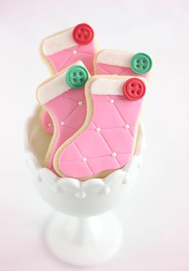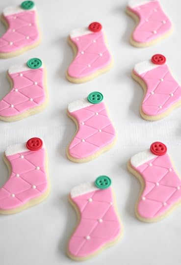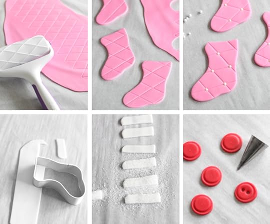 Use the stocking cookie cutter to make stocking-shaped pieces of fondant. Dot the backs of the pieces with corn syrup and lay them on top of a sugar cookie. Place a pearl nonpareil at each intersecting line and press it into the fondant.