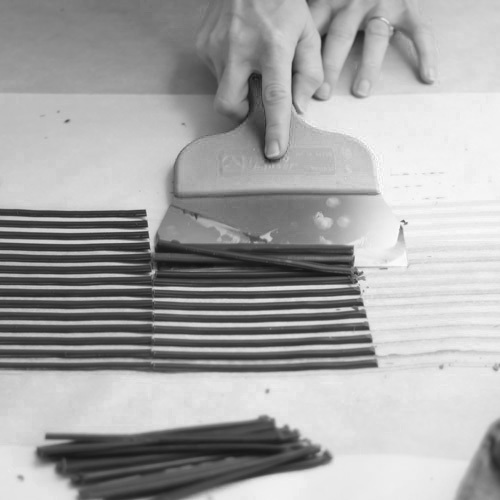 After the chocolate stands for a few minutes and the surface becomes matte, you can cut it into even lengths with the scraper. This particular scraper has a very flexible knife, which is important for removing the sticks from the paper. It glides underneath the sticks easily without breaking the thin pieces of chocolate.