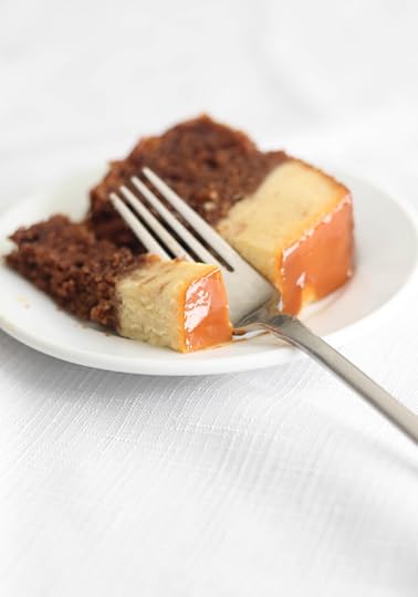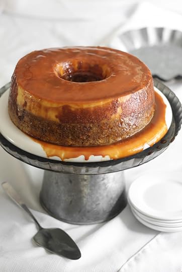 To unmold the cake, fill a large bowl (or your sink) with hot water. Place the bottom of the cake pan in the water to warm the caramel/flan portion of the cake. This will help the cake release. Turn the cake out onto a large serving platter or a cake stand that has a lip. The caramel will drizzle down over the cake as you remove the pan. Store the cake covered in plastic wrap in the refrigerator.