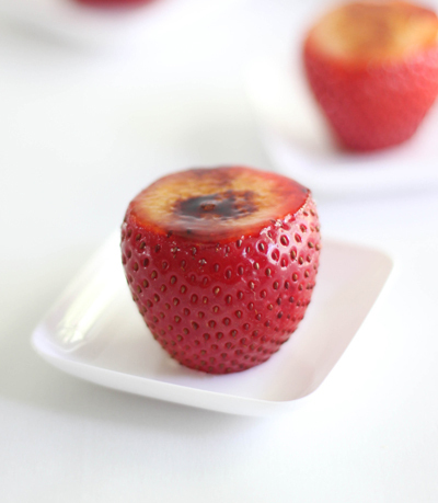 Just before serving, place a spoonful of sugar on top of each berry and use a chef's torch to caramelize the sugar. You can also caramelize the sugar under the oven broiler, just be sure to get it good and hot before you put the strawberries in. The strawberries will break down under heat, so they should only be allowed to stay in the oven for 2-4 minutes, just long enough for the tops to caramelize. Keep a sharp eye on them, it won't take long!