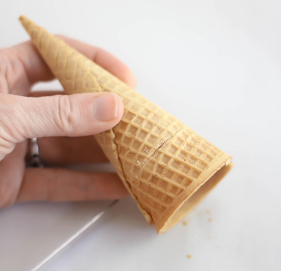 The cones will need to stand upright to be filled. If you don't have a specialty ice cream cone holder (who does?!) then cut several X's into the top of the sugar cone boxes with a serrated knife. Place the cones upright into the X perforations in the box. (See pictures in the blog post for clarification.)