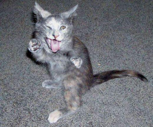 I lost all rational thought to control orderly bodily movements, blindly rising at a violent rate of speed, with the full weight of a kitten hanging from my masculine region.