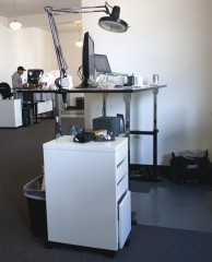 Taller desks are sprouting up, and the tech team at MotiveQuest stands up for health and productivity. When we recently moved offices, we wanted our desks matching and everyone seems to like the larger table top that I have been using for the last year. The desk height is adjustable for sitting or standing, but most of the team has decided to stand finding it more productive and healthy. We have stools to give our feet a rest.