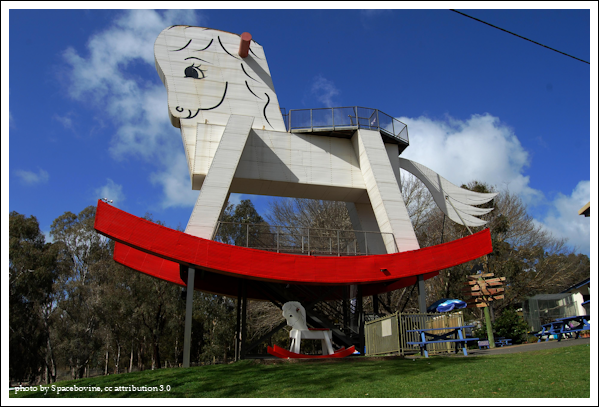 The size comparison with the little rocking horse is accurate – the little one is a proper toy. Mr. Big there, though, is 59 feet tall and weighs over 25 tonnes. The designers, David MacIntosh and John Twopenny took eight months to build it in 1981. The latter of the two then went on to design and build the Big Orange in Berri, in the Riverland, South Australia.
