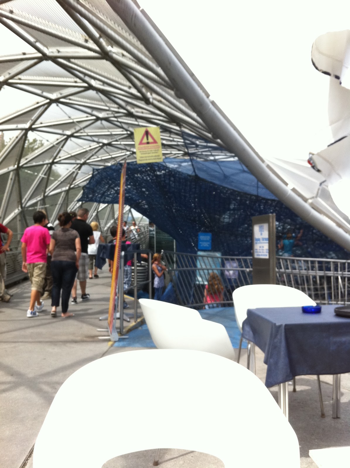 This cafe is located on a man-made island in the middle of the river that flows through Graz. There are regular tables as well as comfy stadium-type seating: