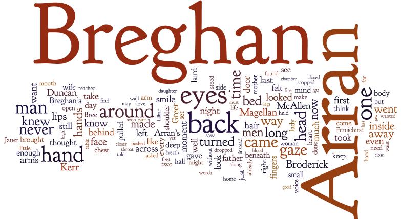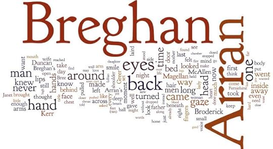 Here's the word cloud (thanks to wordle.net) of the medieval scottish romance I'm currently working on. It's almost done, so the word collection is fairly indictive of the entire story. No points for guessing the names of my main characters, but if you can connect the dots and deduce any spoiler material, I'd be most impressed, lol.