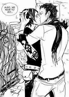Magnus es extravagante y divertido, amante de la moda y de hacer fiestas a las que invita a toda clase de subterráneos (vampiros, hadas, elfos). Alec es parco, tranquilo (un poco mosquito muerto, tal vez), tímido... Y todos nos sorprendemos cuando en el tercer libro, durante la Guerra Mortal, besa en la boca a Magnus enfrente de una multitud de subterráneos y cazadores de sombras, entre los cuales se encuentran sus padres. Alec lo hace porque sabe que Magnus se siente herido de que ni siquiera le haya presentado a su familia, por que tengan que mantener su relación en secreto. Y además porque aún piensa que Alec sigue enamorado de Jace. Y es Jace quien incita a Alec a hacerlo: le dice que lo que siente por él no es amor, sino que sus sentimientos son una excusa para no salir del armario y enfrentarse con lo que siente.
